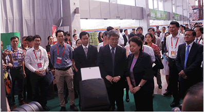 2015年4月16日玉林市市委书记王凯陪同自治区党委常委、统战部部长李康在药博会金拇指网络科技展区指导工作